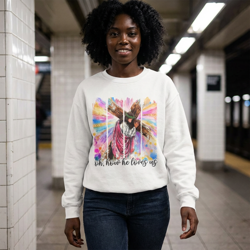 Christian Cross Sweatshirt — "Oh, How He Loves Us" Colorful Easter Crewneck